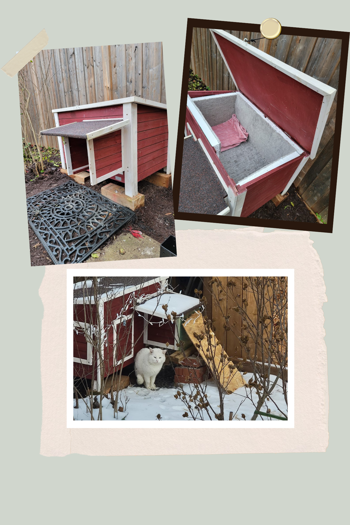 With the bitter Canadian winter on the horizon, I knew Ghost was in for a tough winter outside. I decided to build him an insulated house, complete with a heating pad at the back and a bed of straw at the front to keep out the bitter cold. I also added a few stuffed friends to cheer him up, a pink monkey and a Yoda stuffy.